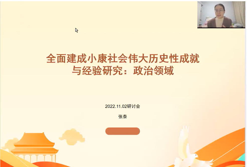 会议伊始,政治组负责人张天舒教授介绍了总课题组的研究进度以及政治子课题组的具体工作。随后,马克思主义学院博士后张泰重点讲解了其负责的“国家治理体系与国家治理能力现代化的历史性成就与经验”模块内容,认为研究重难点在于:厘清全面建成小康社会与国家治理现代化的内在关联,界定国家治理的内涵与外延,总结国家治理的历史性成就和经验,明确国家治理现代化的价值意义。
