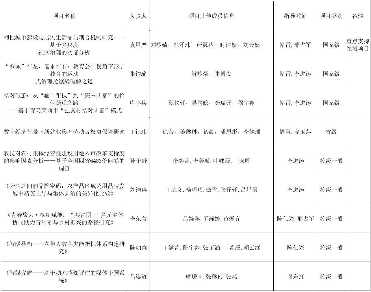 此次立项的9个项目分别为:由中心研究员褚雷、邢占军指导的项目《韧性城市建设与居民生活品质耦合机制研究——基于多尺度社区治理的实证分析》获国家级立项并列入重点支持领域项目;由褚雷、李进涛指导的项目《“双减”在左,需求在右:教育公平视角下影子教育的运动式治理拉锯战破解之道》和《结对破茧:从“输血帮扶”到“突围共富”的价值跃迁之路——基于青岛莱西市“强弱村结对共富”模式》均获国家级立项;中心研究员周慧等指导的项目《数字经济背景下新就业形态劳动者权益保障研究》获评省级立项;中心研究员李进涛指导的《农民对农村集体经营性建设用地入市改革支持度的影响因素分析——基于全国四省 6483 份问卷的调查》和《阡陌之间的品牌密码:农产品区域公用品牌发展中精英主导与集体共治的差异化比较》,中心研究员陈仁兴、邢占军指导的《青春聚力·枢纽赋能:“共青团+”多元主体协同助力青年参与乡村振兴的路径研究》,中心研究员陈仁兴指导的《智暖桑榆——老年人数字失能指标体系构建研究》以及中心研究员谢东虹指导的《智媒安盾——基于动态感知评估的媒体干预系统》分获校级一般立项。