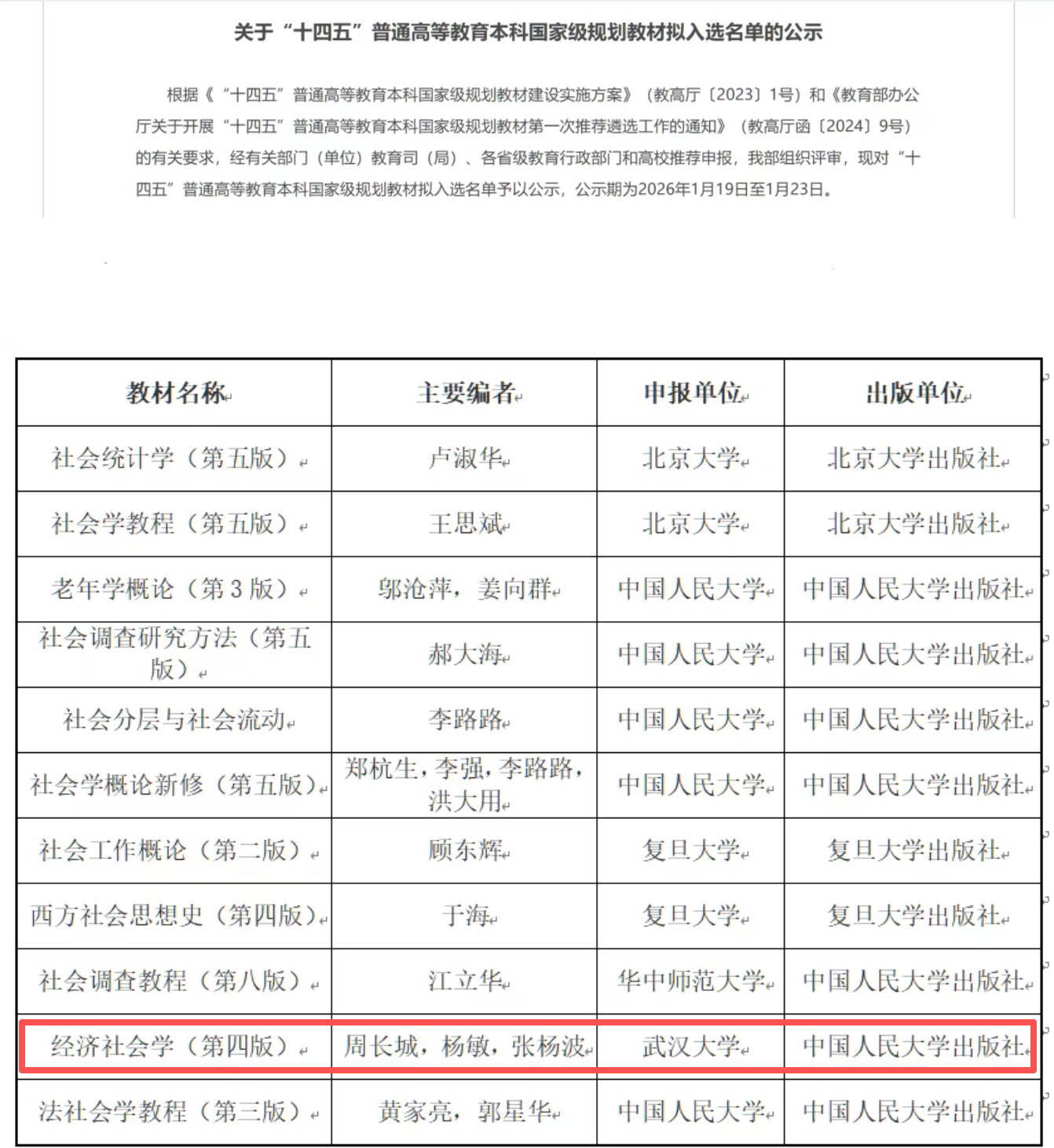 近日,教育部高等教育司公示了“十四五”普通高等教育本科国家级规划教材拟入选名单,山东大学政治学与公共管理学院特聘教授、生活质量与公共政策研究中心学术委员会主任周长城主编的《经济社会学(第四版)》成功入选。这一成果是对周长城教授深耕经济社会学研究和教学工作的国家级认可,也彰显了中心在相关领域学科深耕、教学创新与人才培养融合发展中的扎实功底和鲜明特色。