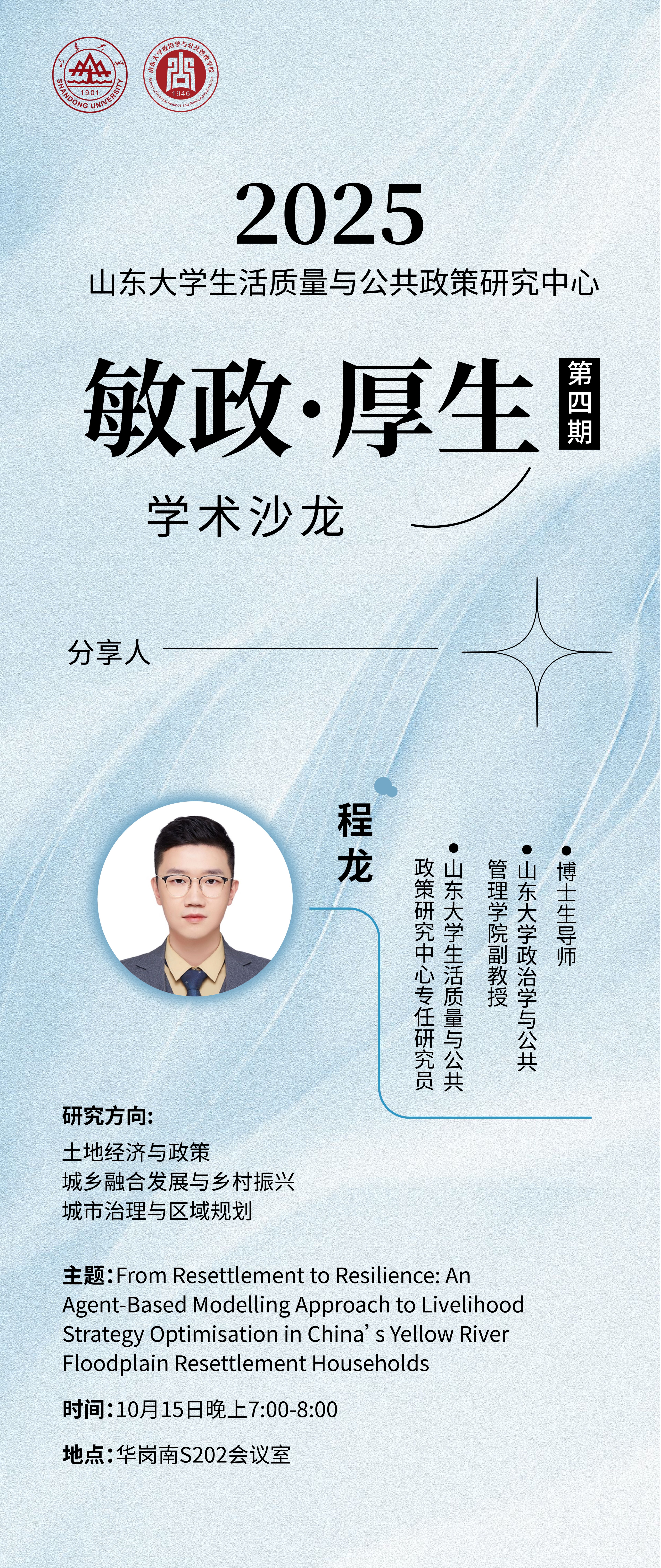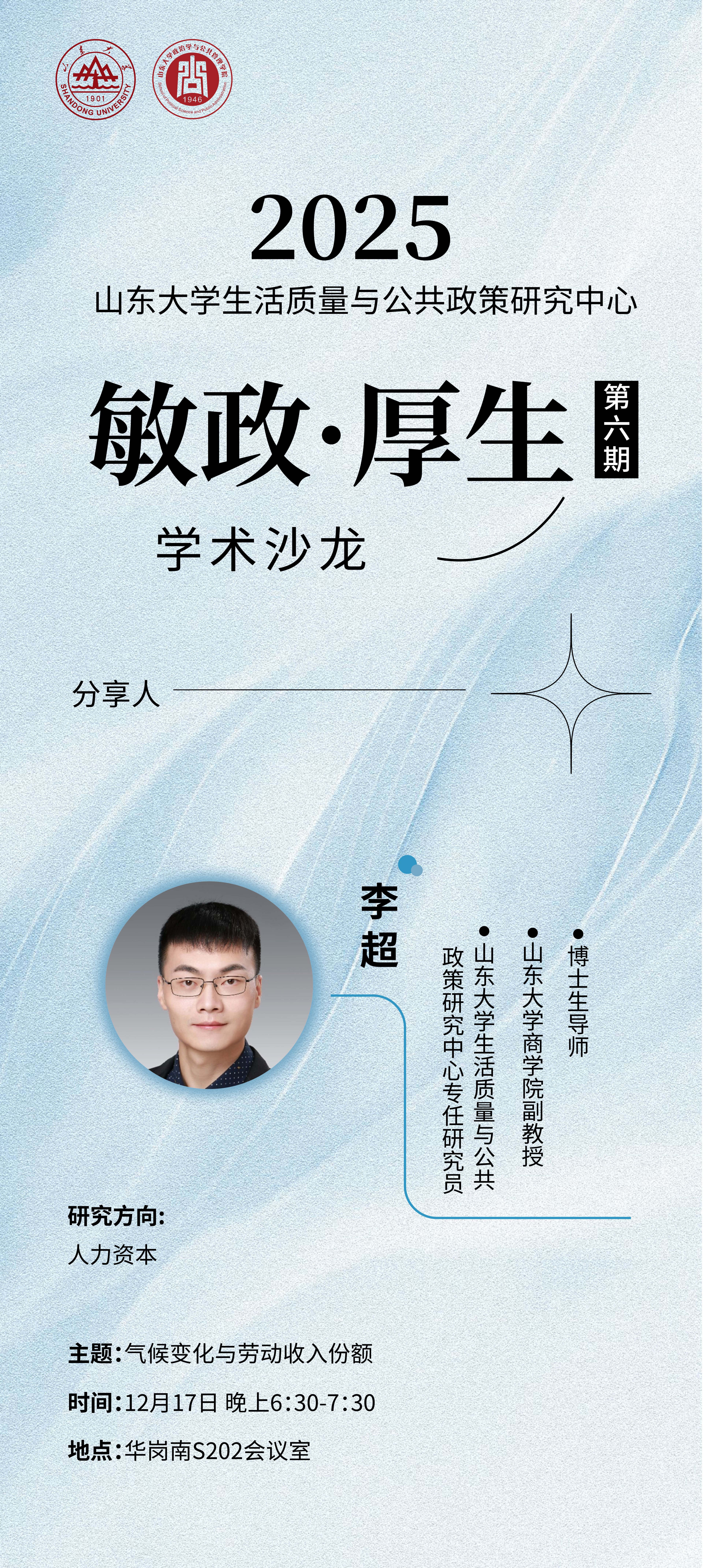 为交流学术成果,提升创新氛围,生活质量与公共政策研究中心将于2025年秋季学期开展系列“敏政·厚生”研究生学术沙龙,由近期承担中心课题的优秀青年学者分享最新研究成果和收获,敬请关注。