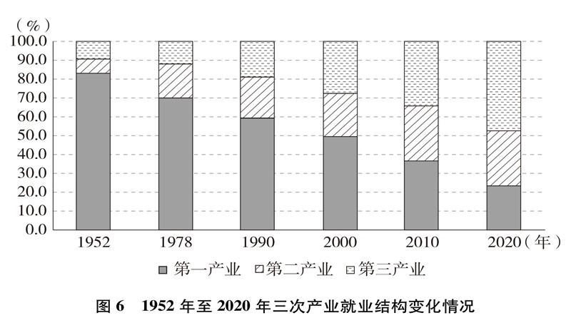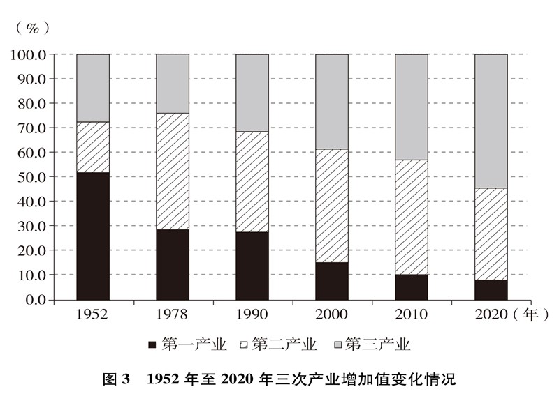 产业结构优化升级。中国已建成世界上最完整的产业体系,产业发展持续向中高端迈进。三次产业增加值之比从1952年的50.5∶20.8∶28.7到2020年的7.7∶37.8∶54.5,中国从传统农业大国成为工业大国、服务业大国(图3),中国经济从依赖单一产业为主转向依靠三次产业共同带动。农业现代化成效显著,机械化、数字化、绿色化、功能化、共享化水平明显提高,广大农民逐步告别“面朝黄土背朝天、一身力气百身 汗”的辛劳,农村生产力极大解放;粮食生产能力稳步提升,实现谷物基本自给,中国人把饭碗牢牢端在自己手中。中国建成门类齐全、独立完整的现代工业体系,工业化和信息化融合发展的广度和深度不断拓展,“中国制造”向“中国智造”转型升级,产业链供应链现代化水平进一步提升。以新一代信息技术、生物技术、高端装备、绿色环保为代表的战略性新兴产业发展迅速,成为引领高质量发展的重要引擎。数字经济激发经济发展新活力,产业数字化和数字产业化趋势加快。现代服务业加速发展,以“互联网+”为标志的新业态、新模式层出不穷,平台经济、共享经济蓬勃兴起,生产性服务业向专业化和高端化发展,生活性服务业向精细化和高品质转变。产业结构的优化升级促进了经济更加均衡、更加充分的发展,人们个性化品质化多样化需求不断得到满足。
