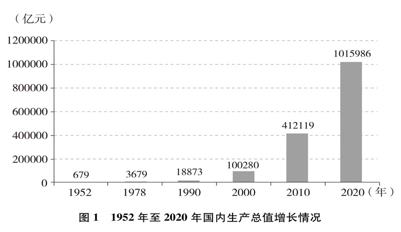 经济实力大幅提升。中国国内生产总值从1952年的679.1亿元跃升至2020年的101.6万亿元,经济总量占全球经济比重超过17%,稳居世界第二大经济体(图1)。人均国内生产总值从1952年的几十美元增至2020年的超过1万美元,实现从低收入国家到中等偏上收入国家的历史性跨越(图2)。制造业增加值多年位居世界首位,220多种工业产品产量居世界第一,自2010年起连续11年位居世界第一制造业大国。中国已是全球货物贸易第一大国、服务贸易第二大国、商品消费第二大国、外汇储备第一大国,2020年利用外资居全球第一。不断迈向共同富裕的14亿多人口,其中有超过4亿并不断扩大的中等收入群体,是全球最具成长性的超大规模市场,中国经济充满活力,具有巨大潜力和充足后劲。2020年,中国率先控制新冠肺炎疫情,率先复工复产,率先实现经济增长由负转正,充分彰显中国经济的强劲韧性。