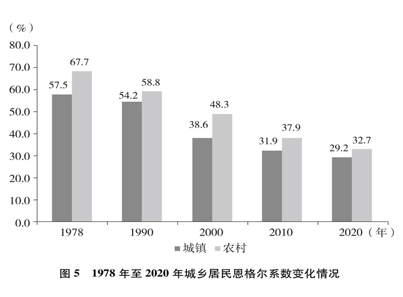 人民生活水平显著提高。居民收入持续增加,全国居民人均年可支配收入从1978年的171元增加到2020年的32189元(图4)。城乡居民恩格尔系数分别从1978年的57.5%、67.7%下降到2020年的29.2%、32.7%(图5),城乡居民生活质量不断提升。温饱问题解决后,人们对生活品质、品位有了更高的追求,衣食住行不断升级,消费结构从生存型逐渐向发展型、享受型过渡。衣,从穿暖到穿美、穿出时尚;食,从吃饱到吃好、吃出健康;住,从有所居到更敞亮、更宜居;行,从便利通畅到快捷舒适。吃穿用有余,家电全面普及,乘用汽车快速进入寻常百姓家。餐饮、健康、教育、旅游、文娱等服务性消费持续快速增长,在居民人均消费支出中占比逐渐达到一半左右。越来越多的人有“钱”有“闲”,“诗和远方”更加触手可及,“说走就走”不再是梦想,旅游扮靓人们的幸福生活,中国正在进入大众旅游时代。